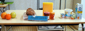 L'animateur a mis une table où il y a du lait, deux yaourts, du fromage,